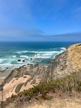Rocky ocean coast, ocean bay with rocky coast and sand beach, blue sky, no people