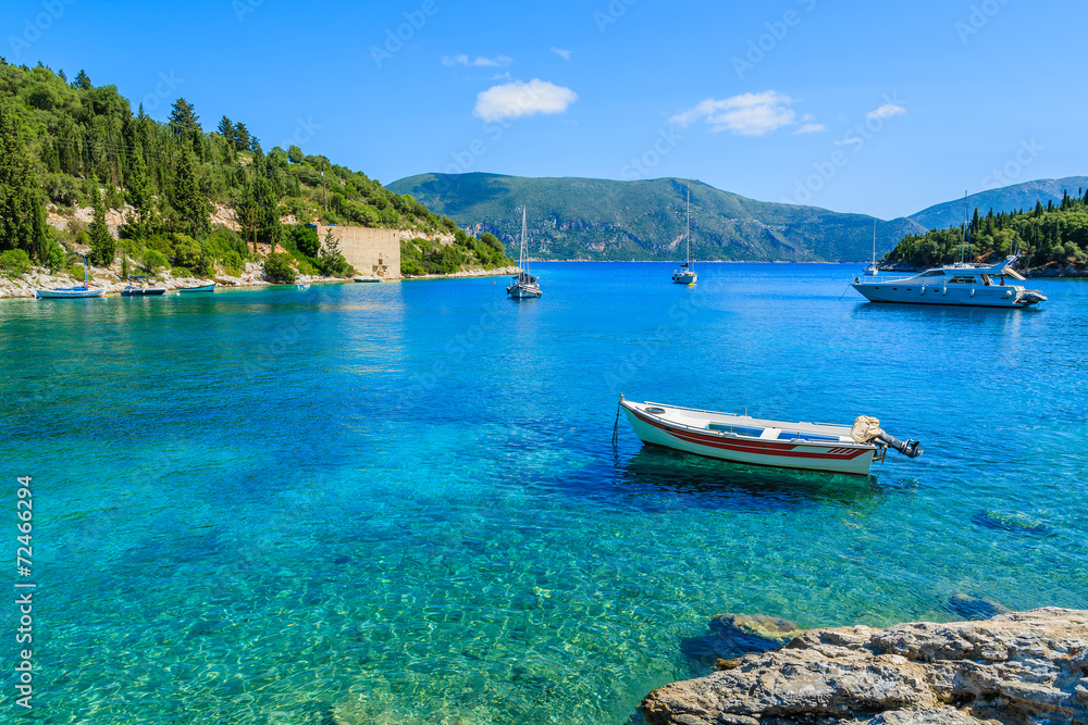 Fishing boat in sea in bay, Fiskardo village, Kefalonia island