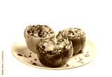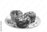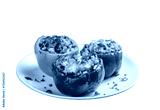 Stuffed peppers, halves of peppers stuffed with rice, dried tomatoes, herbs and cheese in a baking dish on a blue wooden table, top view. (Turkish name; biber dolmasi)