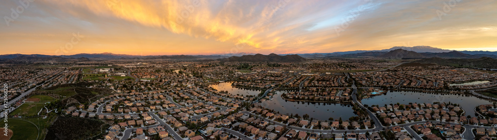 Sunrise in Menifee, California., USA. This is a 5 image aerial panoramic at 400' above ground level.