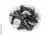 Delicious dolma (sarma) stuffed grape leaves rice, white yogurt sauce. Lebanese dolma sarma on plate. Lebanon turkish greek middle eastern cuisine. (Turkish name; Yaprak sarma)