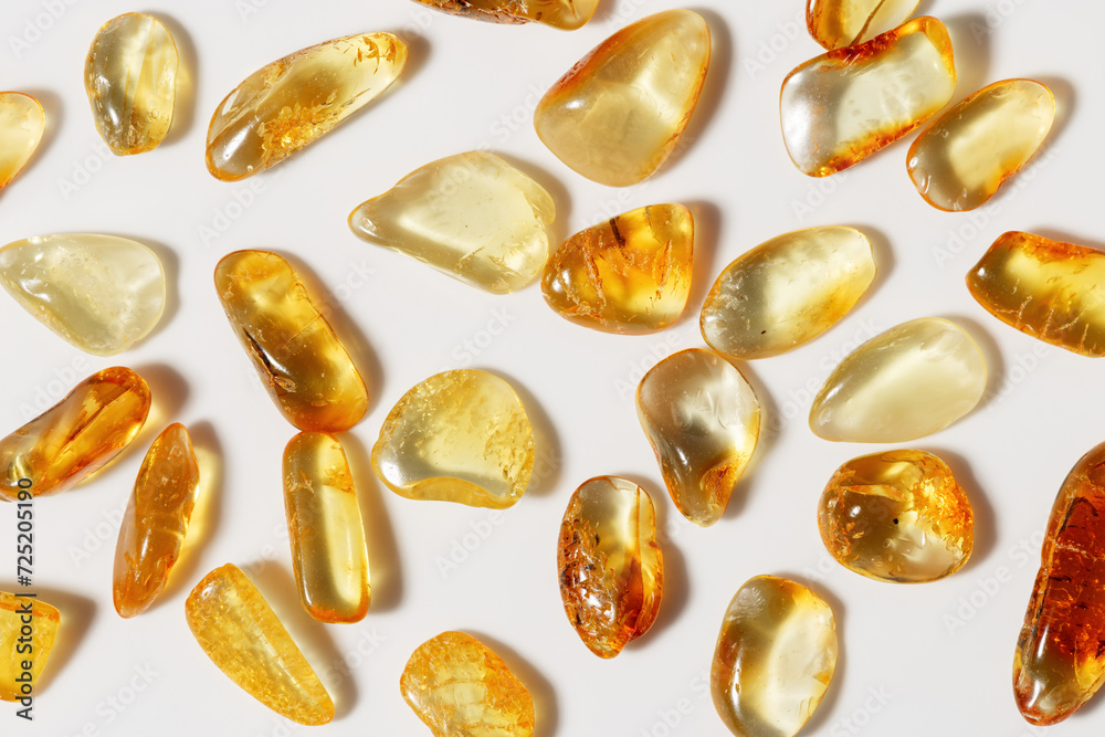 Amber stones at sunlight on light background, stone yellow beige color. Natural gemstone mineral material, healing crystal. Top view Amber texture. Nature gems, pieces ancient resin.