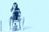 Young woman talking by retro telephone with gift box on chair against pink background. International Women's Day