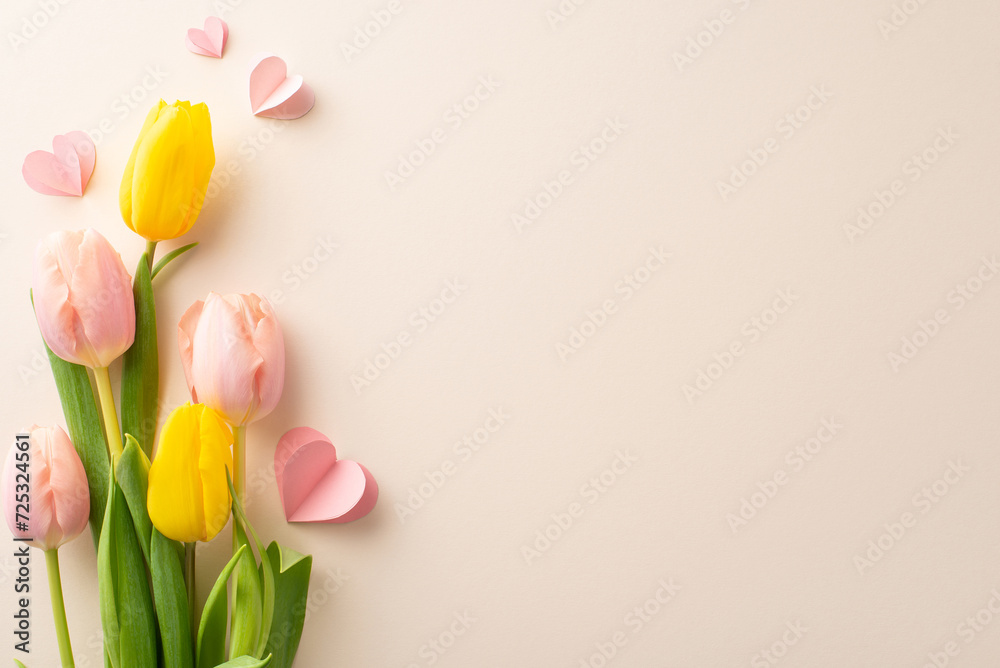 Make her day special: top view splendid bouquet of tulips, and sweet hearts on a pastel beige background, offering space for your message