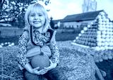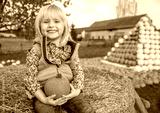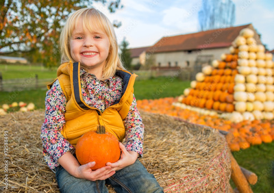 Portrait of happy child sitting on haystack with pumpkin