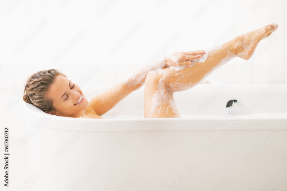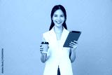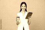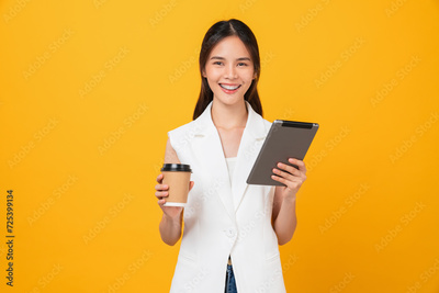 Studio shot of Beautiful Asian businesswoman holding digital tablet and smiling on yellow background.