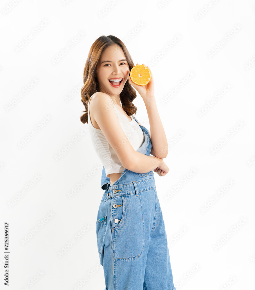 Charming joyful girl holding juicy orange on white background, vitamins for healthy skin.