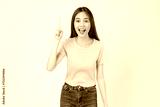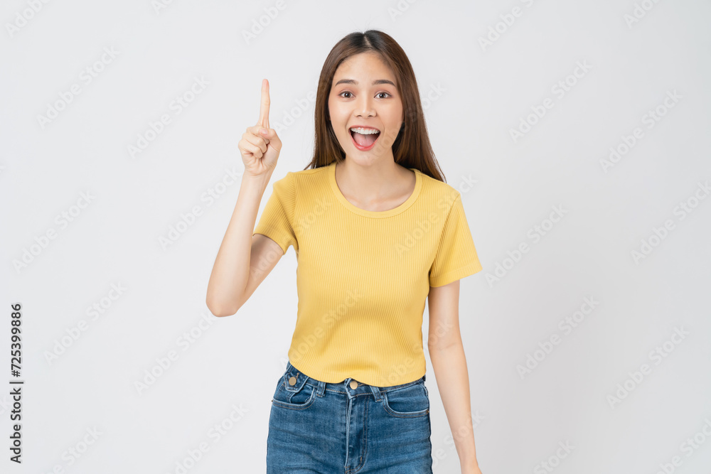 Studio shot of cheerful beautiful Asian woman in yellow t-shirt and stand with pointed his finger at the empty space on white background.