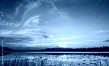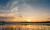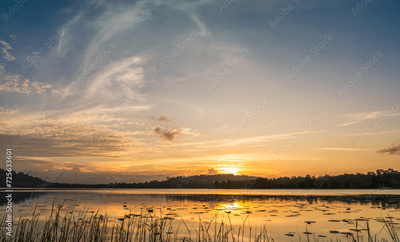 Sunset sky in the evening over mountain lake with orange sunlight cloud, Landscape horizon sky background