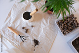 Repotting chamaedorea palm plant at home. Houseplant hobby. Copy space