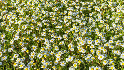 Field full of beautiful wild daisy flowers. Landscape of natural daisies in landscape format for wallpaper with copy space. wild chamomile field