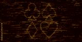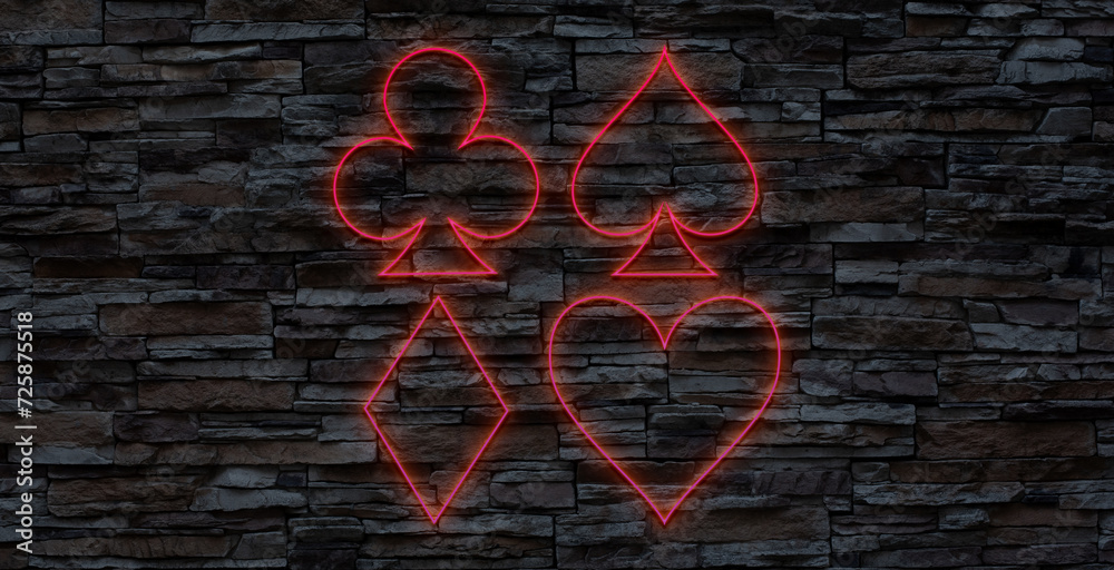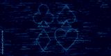Glowing neon card suit symbols. Purple clubs and spades for a gambling poker game. Heart and diamonds for lucky vector win and jackpot.