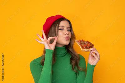 Beautiful young woman with pizza on isolated orange background.