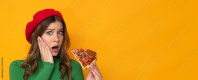Beautiful young woman with pizza on isolated orange background.
