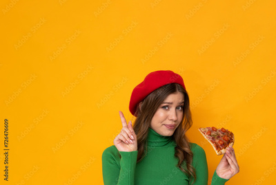 Beautiful young woman with pizza on isolated orange background.