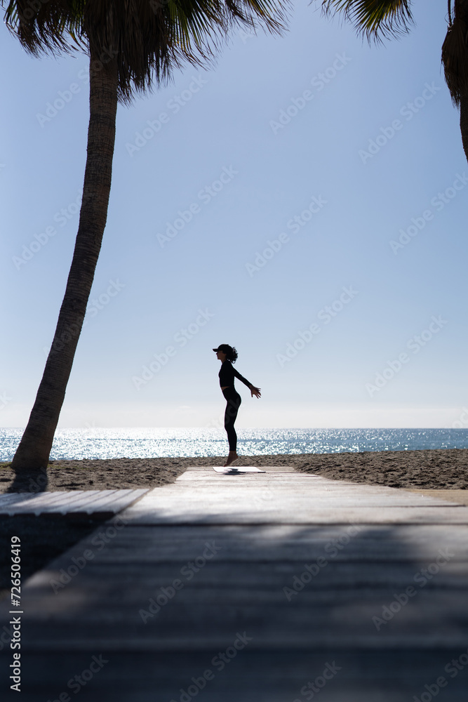 A young woman goes in for sports on the seashore. Women perform sports exercises. body silhouettes on the seashore. there is space for text