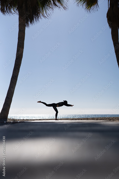 A young woman goes in for sports on the seashore. Women perform sports exercises. body silhouettes on the seashore. there is space for text