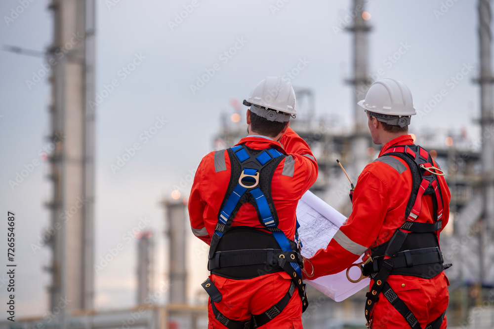 Engineer survey team wear uniform and helmet stand workplace checking blueprint project , radio communication and engineer box inspection work construction site with oil refinery background.