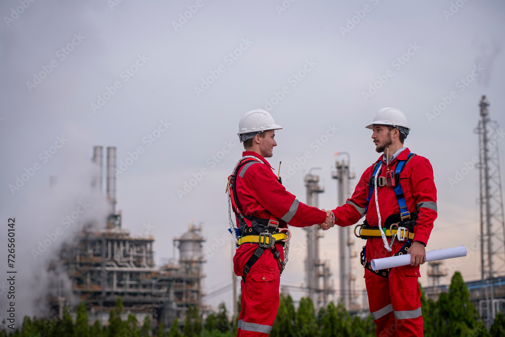 Engineer survey team wear uniform and helmet stand workplace checking blueprint project , radio communication and engineer box inspection work construction site with oil refinery background.