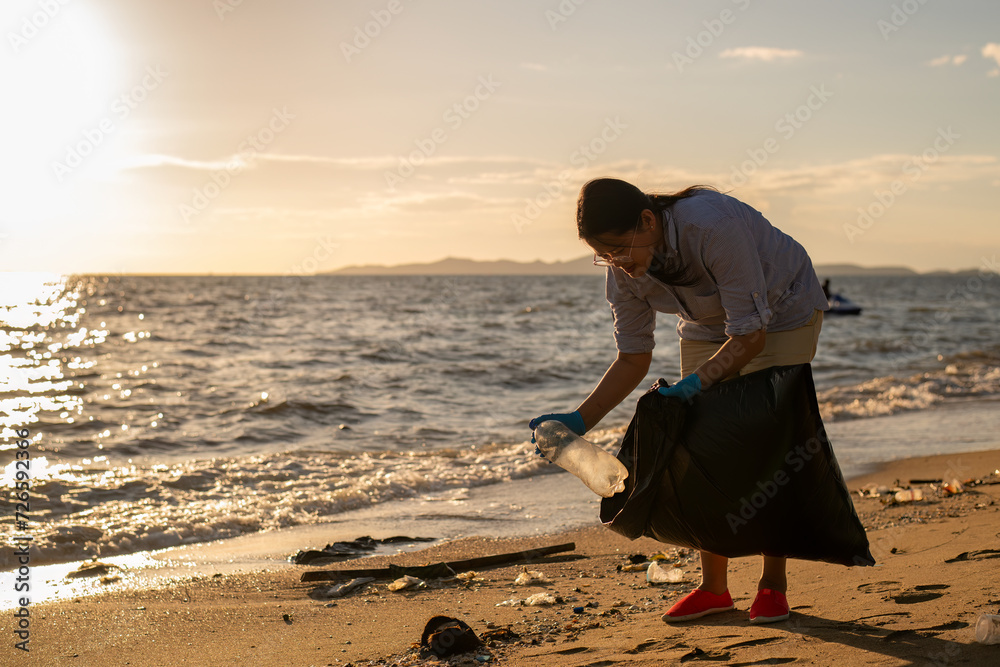 Woman under picking up plastic bottle garbage environment pollution cleaning up on the beach is volunteer concept with sunset sky background.