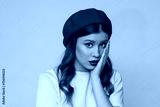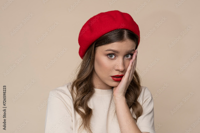 Shocked young woman on light brown background.