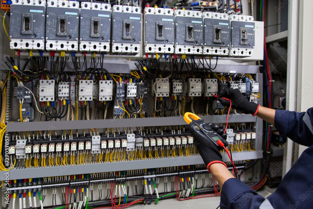 Electricity and electrical safety maintenance service system, Technician hand checking electric current voltage at circuit breaker terminal and cable wiring in main power distribution board.