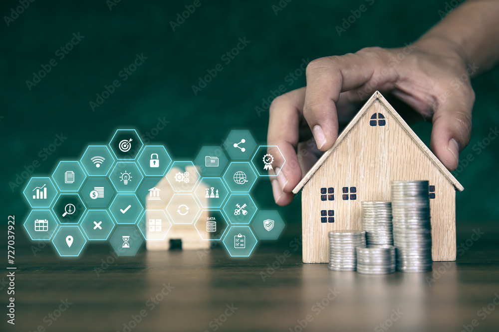 Hand choose house with coins stack in graph with business symbols icons for real estate or money savings plan ideas and investment planning goal to growth and bank home loan or financial insurance.