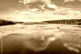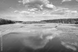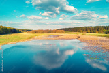 Aerial view of the countryside on a sunny day. Pond in a meadow surrounded by forest. Beautiful natural landscape with cloudy sky