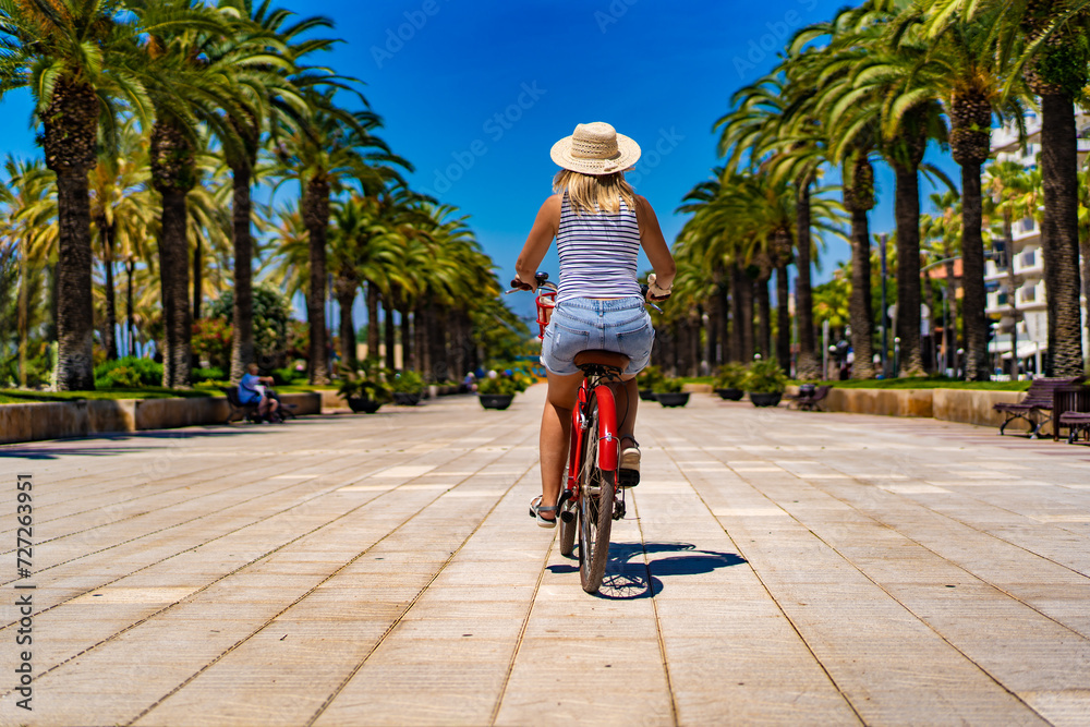 Woman riding bicycle on seaside boulevard Costa Dorada Spain