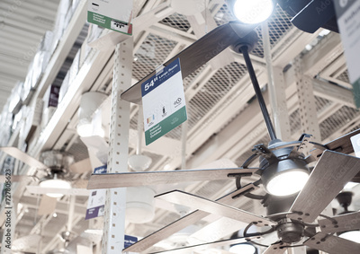 Close-up modern ceiling fan with lights on display at hardware improvement store in Dallas, Texas, upward view indoor outdoor air circulation, electric home appliance, price tags, selective focus