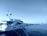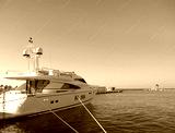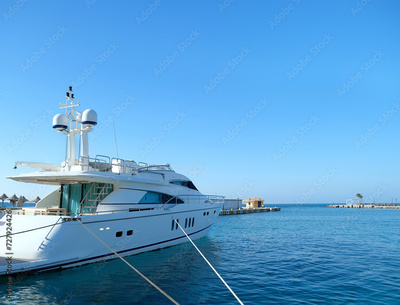 white private motor yacht in seaport, blue water and sky natural background. Exotic tourism, Marine tropical Vacation. Adventure, travel recreation concept. template for design