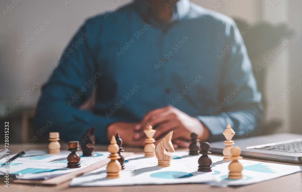 business, management, planning, strategy, chart, plan, leader, manager, chess, professional. businessman put on casual suit in front of chess piece on document with chart progress to hit the goal.