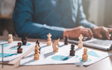 business, management, planning, strategy, chart, plan, leader, manager, chess, professional. businessman typing keyboard then nearby chess piece and consider moves in next turn to hit the goal.