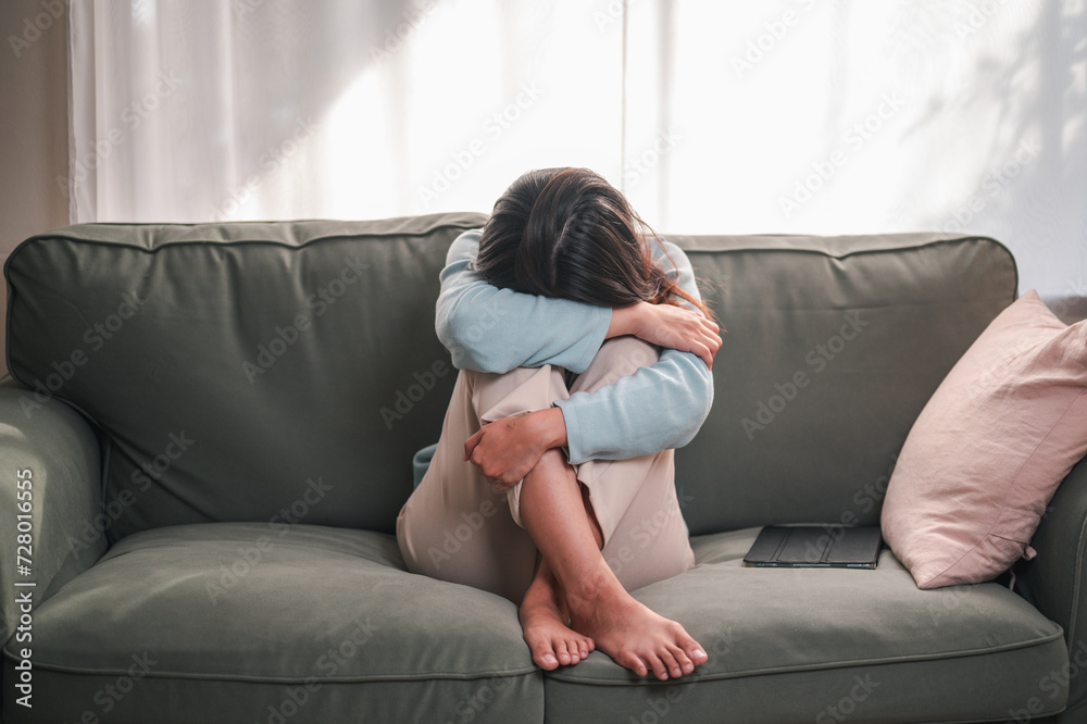 sad, depression, unhappy, depressed, lonely, problem, upset, alone, sofa, bad. depressed young woman sitting on couch in home, frustrated confused female feels unhappy problem in personal life.