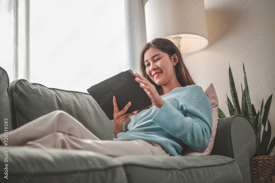 woman, happy, home, lifestyle, sofa, tablet, online, sitting, communication, young. beautiful woman relaxing on comfortable sofa with tablet, playing social or chatting online via social networks