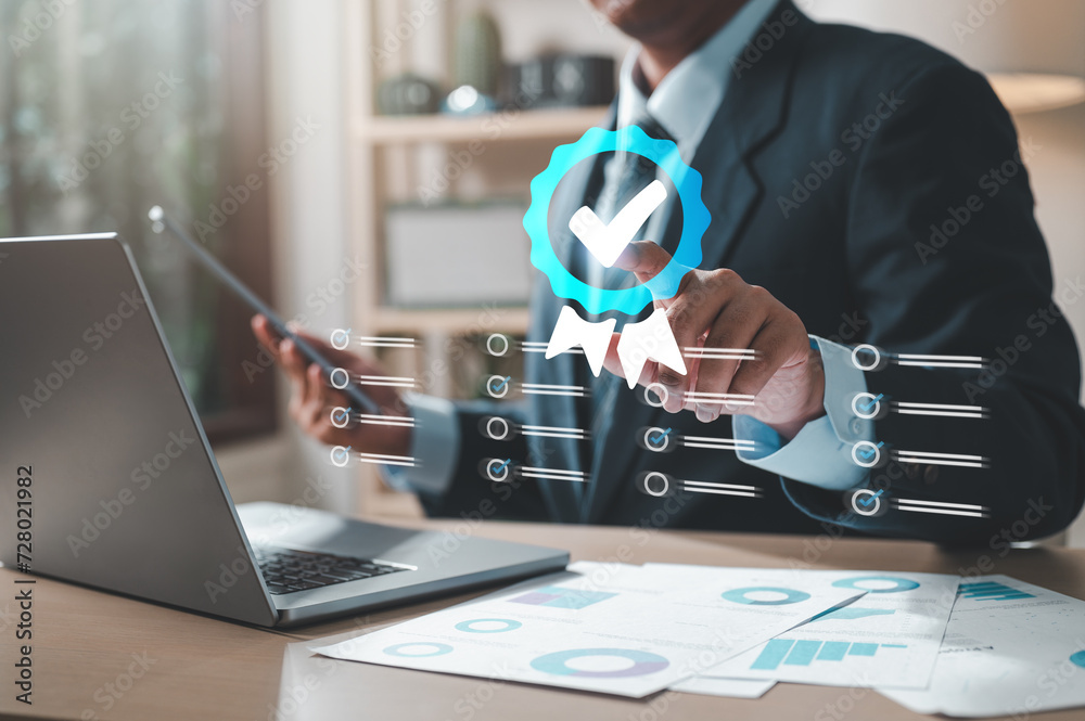 approval, business, certificate, guarantee, management, document, company, manager, marketing, plan. ISO quality control, businessman using tablet for certificate icon for international standard.