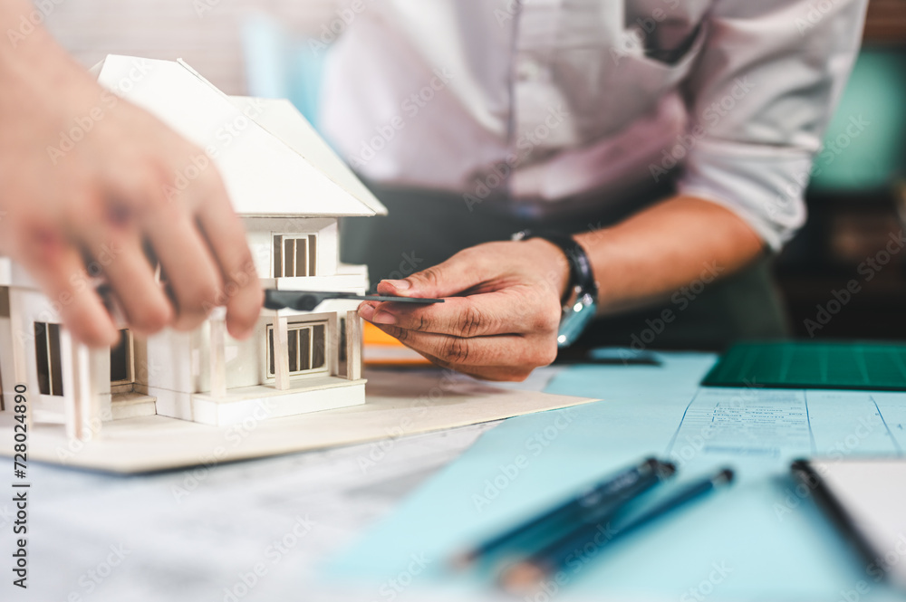 architecture, architect, construction, engineer, project, design, blueprint, house, model, plan. close-up engineer hand of architect house model building samples with paper art architecture tools.