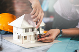 architecture, architect, construction, engineer, project, design, blueprint, house, model, plan. close-up engineer hand of architect house model building samples with paper art architecture tools.