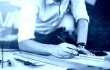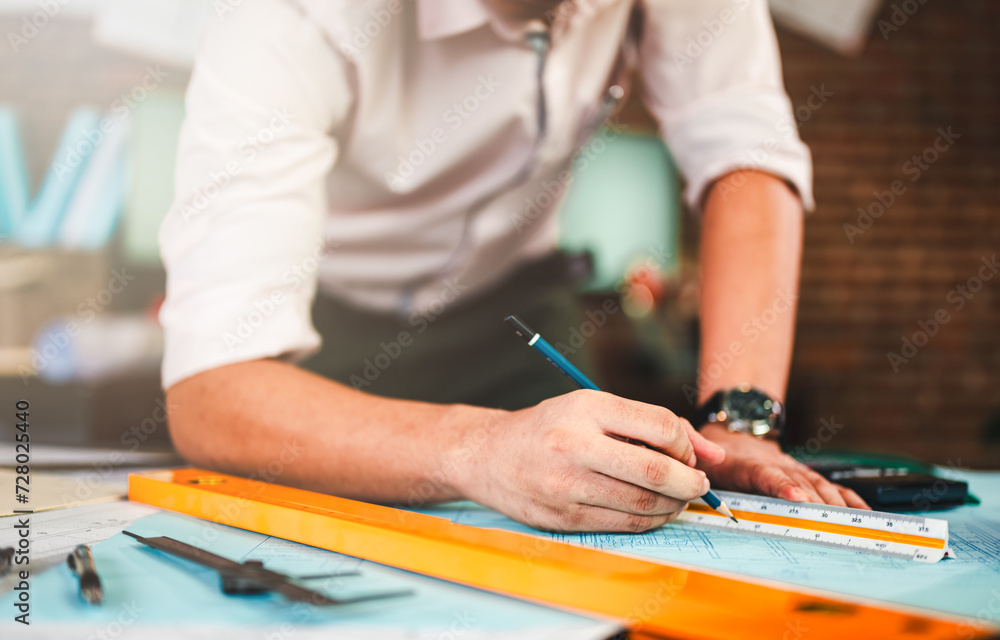 architecture, architect, construction, engineer, project, design, blueprint, house, model, plan. engineer use pencil and ruler to measure architects on the desk with a blueprint in the office.