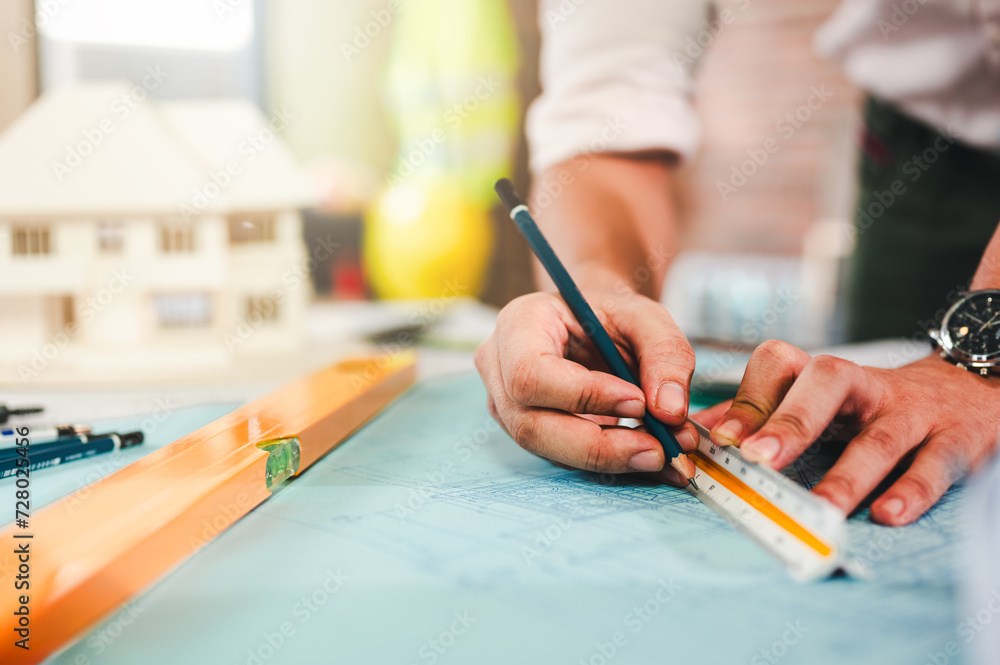architecture, architect, construction, engineer, project, design, blueprint, house, model, plan. engineer use pencil and ruler to measure architects on the desk with a blueprint in the office.