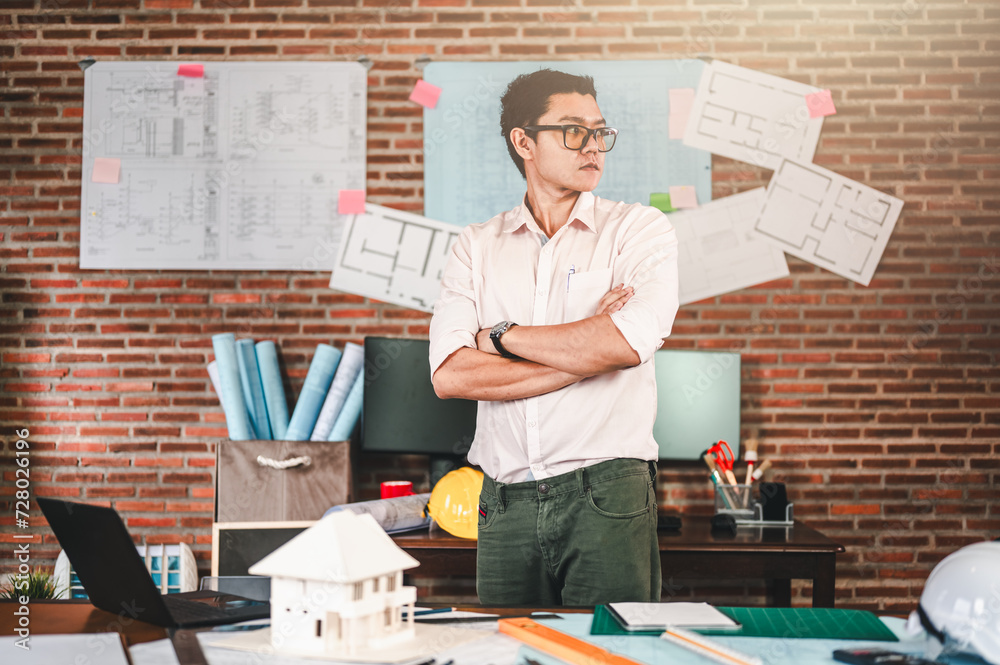 architecture, architect, construction, engineer, project, design, blueprint, house, model, plan. architect engineer crosses arms and poses confidently with a house model at office with blueprint.