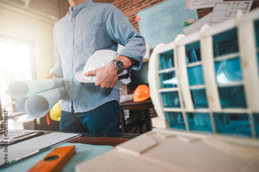architecture, architect, construction, engineer, project, design, blueprint, house, model, plan. engineer holding paperwork blueprint roll and holding helmet opposite side. with in front of 3D model.