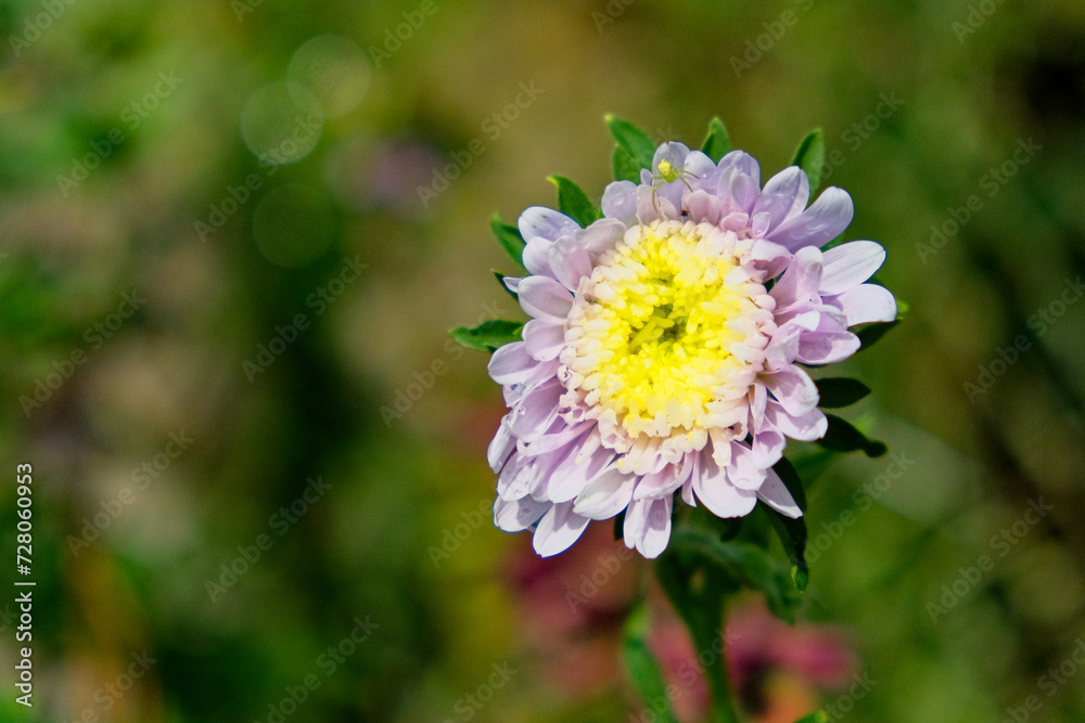 A vibrant purple flower with a yellow center, surrounded by greenery.