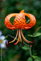An orange flower with dark spots and long stamens, surrounded by greenery and a blurred background.