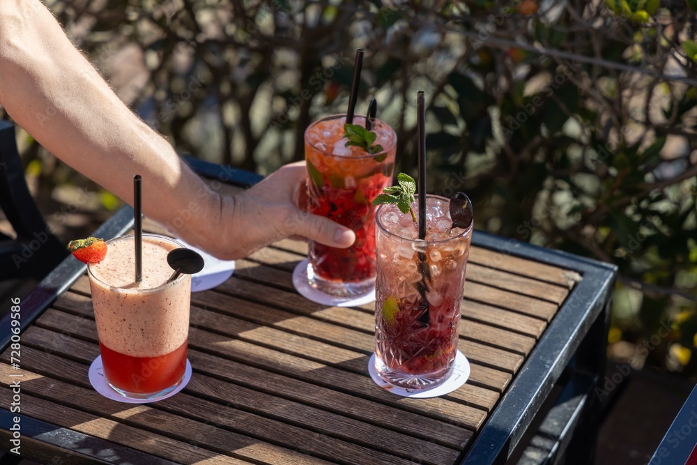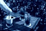 A person's hand reaching for a refreshing cocktail garnished with mint on a sunny outdoor table.