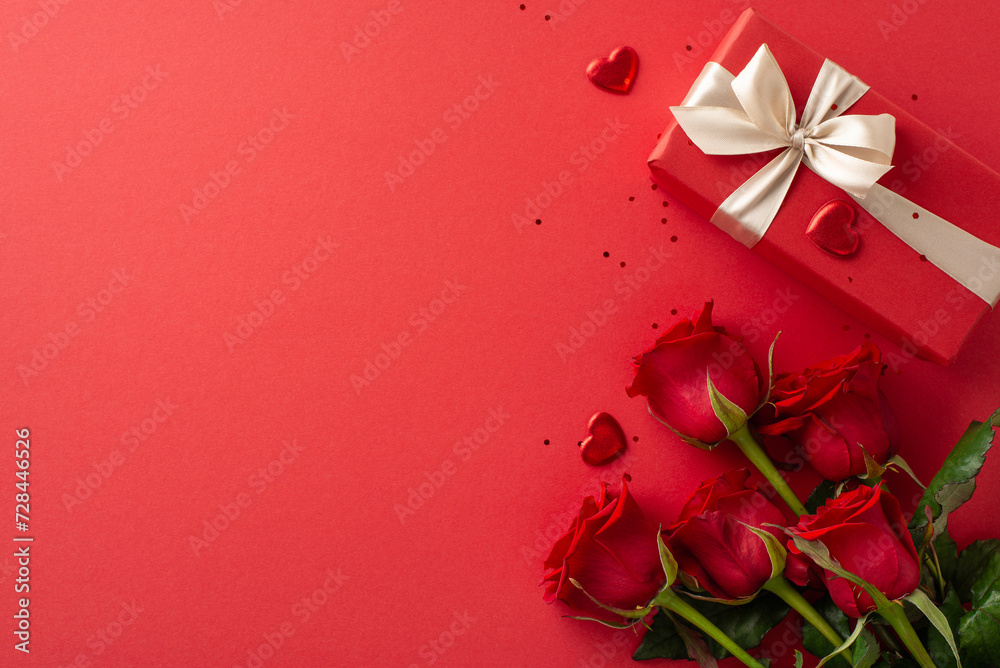 Elegant lady's gift scene: top view lavish spread of roses, stylish present, hearts, and shimmer on a red surface, designed with space for text or publicity