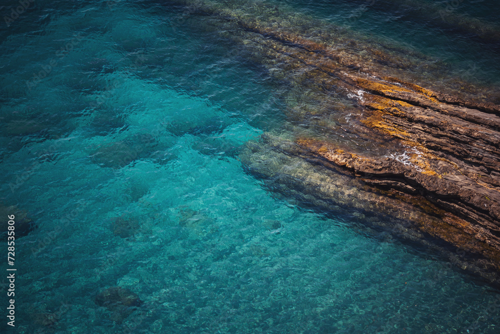 Aerial view of calm turquoise sea water and rocks from molten lava from drone. Pattern of sea surface and rocky shore. Liguria, Italy. turquoise water of Ligurian sea.