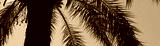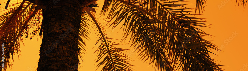 Palm tree against the sunset sky. Tropical evening landscape. Horizontal banner
