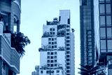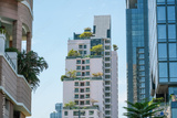 Trees plants on roof garden modern multistorey sunny building, inspired by urban architecture, landscape design and the environment. Exotic tropical climate