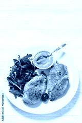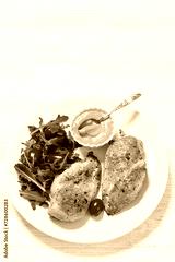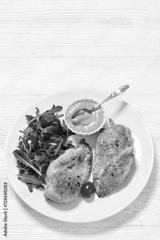 fried chicken breasts with green salad on plate